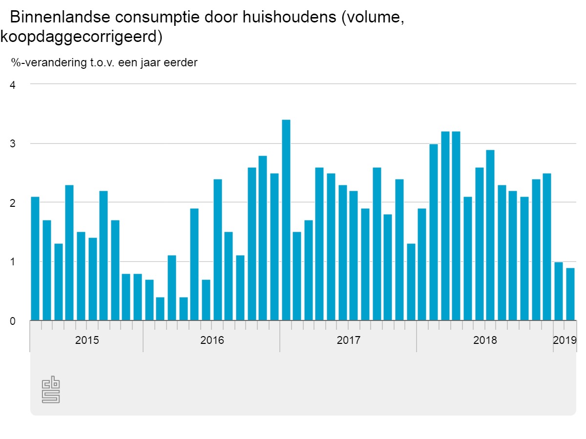 Consumenten hebben in februari 0,9% meer besteed dan in februari 2018. Volgens de CBS Consumptieradar zijn de omstandigheden voor de consumptie in april even gunstig als in februari. De consumptie van overige goederen, zoals energie en motorbrandstoffen, lag in februari 7,5% lager dan een jaar eerder. Door het zachtere weer in vergelijking met een jaar eerder werd er vooral minder gas verbruikt. Aan duurzame goederen besteedden consumenten daarentegen bijna 5% meer dan een jaar geleden. Er werd vooral meer uitgegeven aan woninginrichting en huishoudelijke apparaten. Ook gaven consumenten iets meer uit aan voedings- en genotmiddelen dan een jaar eerder. Aan personenauto’s hebben consumenten echter minder besteed.
