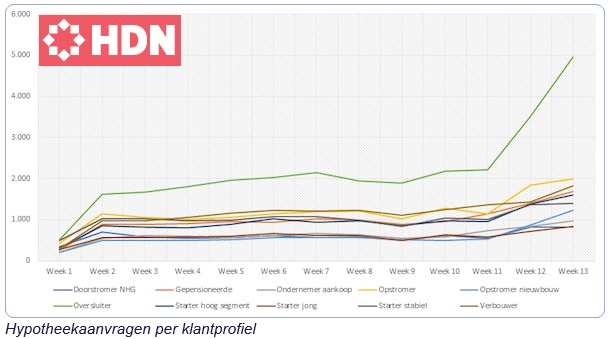 HDN heeft het aantal hypotheekaanvragen binnen het klantprofiel ‘oversluiters’ de afgelopen twee weken zien verdubbelen naar bijna 5.000 aanvragen in week 13. De HDN klantprofielen ‘Starter Jong’, ‘Starter Stabiel’, ‘Hoogsegment starter’ en ‘Doorstromer NHG’ zijn procentueel iets gedaald.