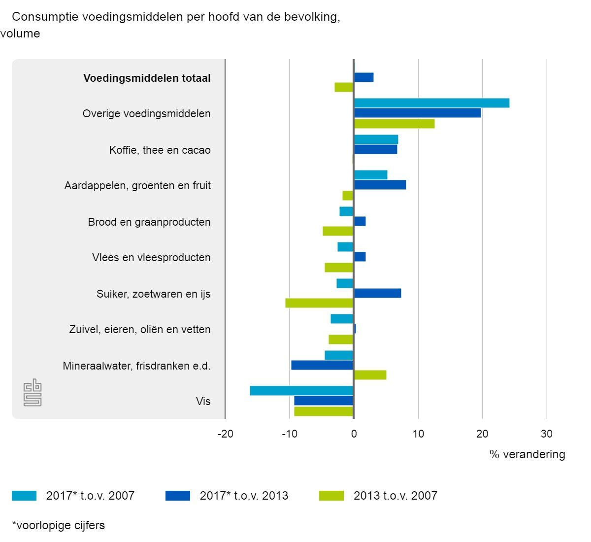 Het aandeel van huisvesting bedroeg in 2018 15,4% vergeleken met 12,8% tien jaar eerder. De toename komt vooral door huurverhogingen. Aan energie en water werd in 2018 een kleiner deel gespendeerd dan tien jaar eerder. Het aandeel van voedingsmiddelen en alcoholvrije dranken nam na 2007 toe, van 7,3% in 2007 naar 8,1% in 2018. Het aandeel steeg tot 2013 vooral door prijsstijgingen, daarna steeg ook het volume per hoofd. De consumptie van de overige voedingsmiddelen, zoals kant-en-klaarmaaltijden, soepen en babyvoeding groeide het meest. Verder stegen ook de bestedingen aan aardappelen, groente en fruit en koffie, thee en cacao.