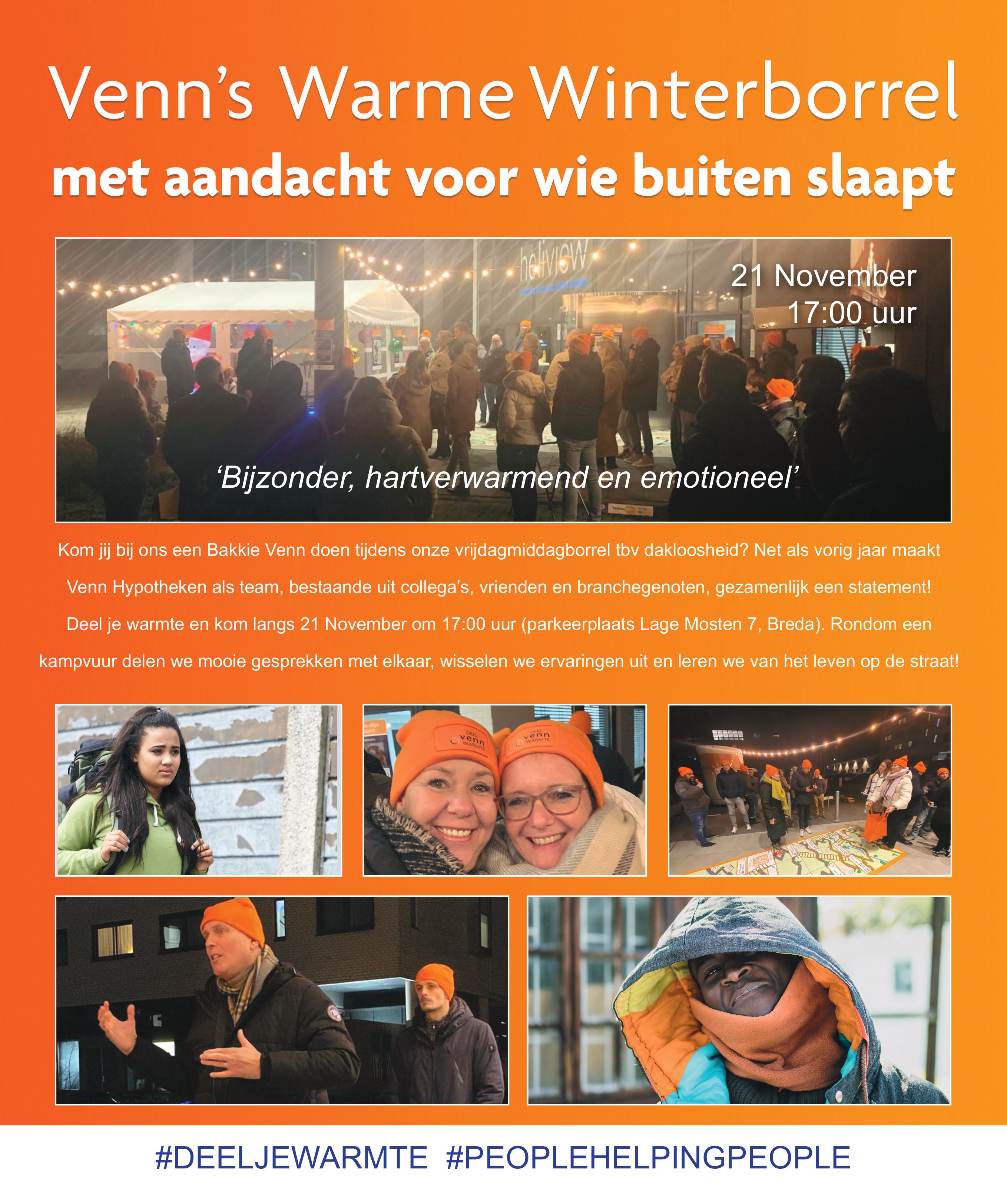 Aankomende vrijdag 21 november is de volgende editie van Venn’s Warme vrijmibo Winterborrel. “Rondom een kampvuur delen we mooie gesprekken met elkaar, wisselen we ervaringen uit en leren we van het leven op straat. Deel je warmte en kom langs bij de aftrap vrijdag 21 november om 17:00 uur op de parkeerplaats van Venn Hypotheken, Lage Mosten 7 in Breda. Mag ik je vragen een paar nieuwe, warme sokken mee te brengen zodat we die kunnen doneren aan hen die deze warmte heel goed kunnen gebruiken. Ook zijn we heel blij met (oude) slaapzakken. Dus lever ook die vooral bij ons in vrijdagmiddag. Samen kunnen we het verschil maken. Ontmoeten we jou ook vrijdag?”
