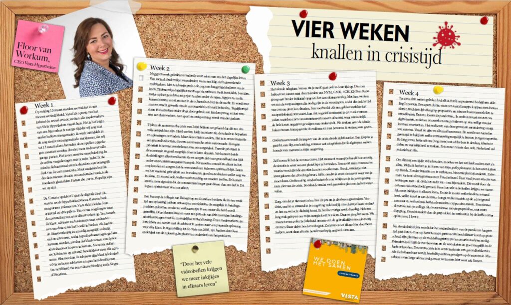 Floor van Workum, CEO Vista Hypotheken, beschrijft in dagboekvorm hoe zij de afgelopen vier weken heeft beleefd. “Tot circa drie weken geleden had elk zichzelf respecterend bedrijf een afdeling Innovatie. Een apart clubje, waar een aantal knappe koppen met dwarse ideeën trachtten life-changing-proposities en nieuwe businessmodellen te ontwikkelen. Toen kwam de pandemie en zijn we ineens allemaal een innovator.”
