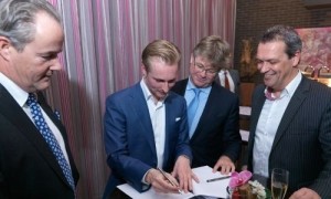 Op de foto v.l.n.r. Olivier Rupke, Wesley van ’t Hof, notaris Paul Eversdijk en Rob Timmermans
