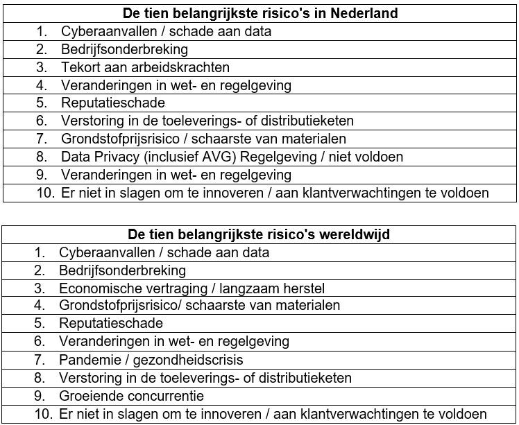 Nederlandse werkgevers zien cyberaanvallen/schade aan data, bedrijfsonderbreking en een tekort aan arbeidskrachten als de top drie belangrijkste risico’s voor 2022.