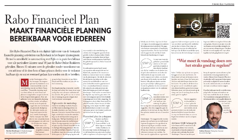 “Financiële planning werd voorheen alleen via onze financieel planners aangeboden aan particulieren in het hogere klantsegment. Deze uitgebreide vorm van financiële planning is echter minder schaalbaar, terwijl we in de praktijk zagen dat een veel bredere en groeiende doelgroep de relevantie voelde om financieel vooruit te kijken”, vertelt Hombergen. “In het voorjaar van 2020 zijn we met een projectteam van start gegaan om ook voor die klanten een toegankelijke vorm van financiële planning mogelijk te maken. Veel mensen verdiepen zich niet graag in hun financiën en met Rabo Financieel Plan maken we juist dit nu heel eenvoudig. Een laagdrempelige propositie waarbij de klant zelf achter het stuur zit en waar nodig door een adviseur ondersteunt kan worden. Het geeft rust om te weten dat je vandaag de goede dingen doet voor je doelen van morgen.”